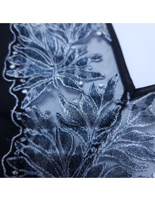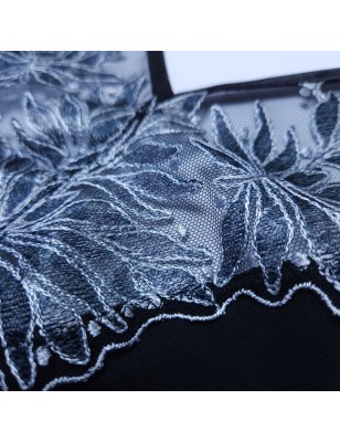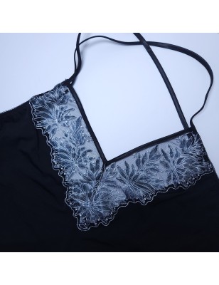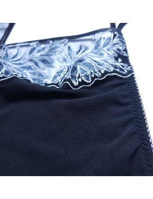 The fitted design includes adjustable, braided shoulder straps and a cross-back pattern that adds a unique touch. You can even request longer straps for a more customized fit. Created for those with discerning tastes, this camisole is crafted from premium European fabrics and exhibits stellar craftsmanship. The embroidered V-shape cleavage on the front provides a sheer, sensual touch, and the soft mesh on the bottom ensures comfort throughout the evening.