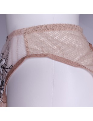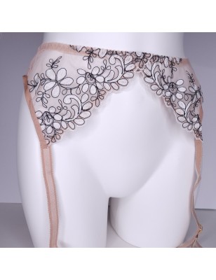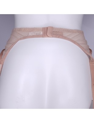 Beige mesh sissy garter belt for men. Adjustable hook and eye closure, extra large sizes available too. Match with panties and AA cup bra for men.  This garter belt is made of elastic durable mesh lace.