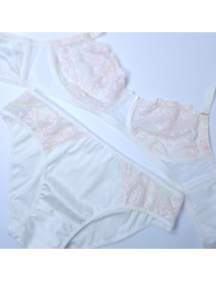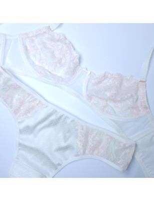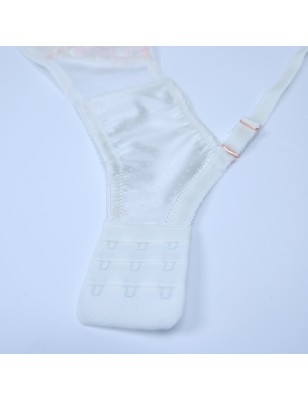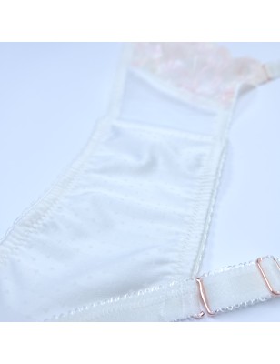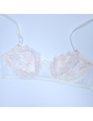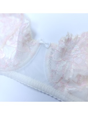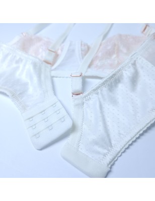 The bra features fully adjustable and removable straps, adjustable hook and eye closure and longer straps. The band made of light cream satin, cups of light pink, soft lace.