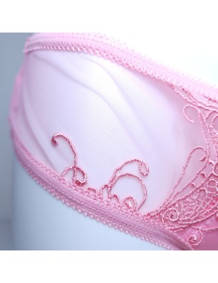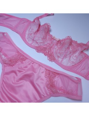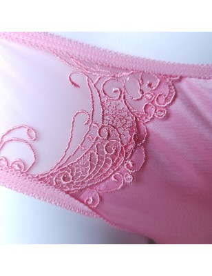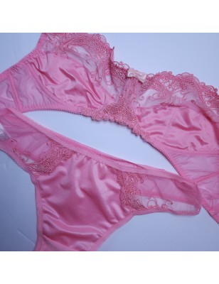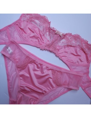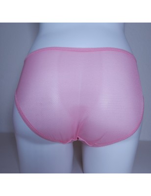 Pink feminine sissy panties made of satin end mesh. The color is as shown, and quality of craftsmanship is outstanding. European fabrics. Satin on front, mesh with embroidery on front sides, elastic durable mesh on back.